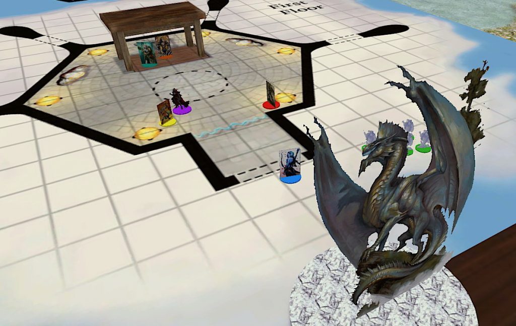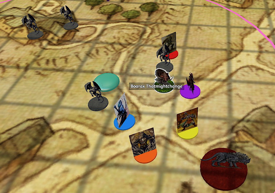 The main highlight was the DM pointing out that the player minis had all been recreated with white bases, allowing the DM to tint them to the player’s Table Top Simulator name colours for easier identification of who is who (whom? I’m sorry, my face is tired).